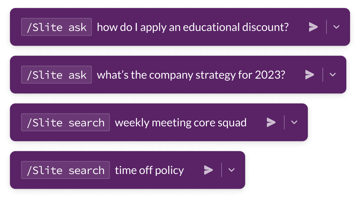 Get trusted company information based on verified docs, instantly. Whether it’s with our AI assistant Ask, lighting fast search, or Slack integration, you can always find the answers you need with Slite.