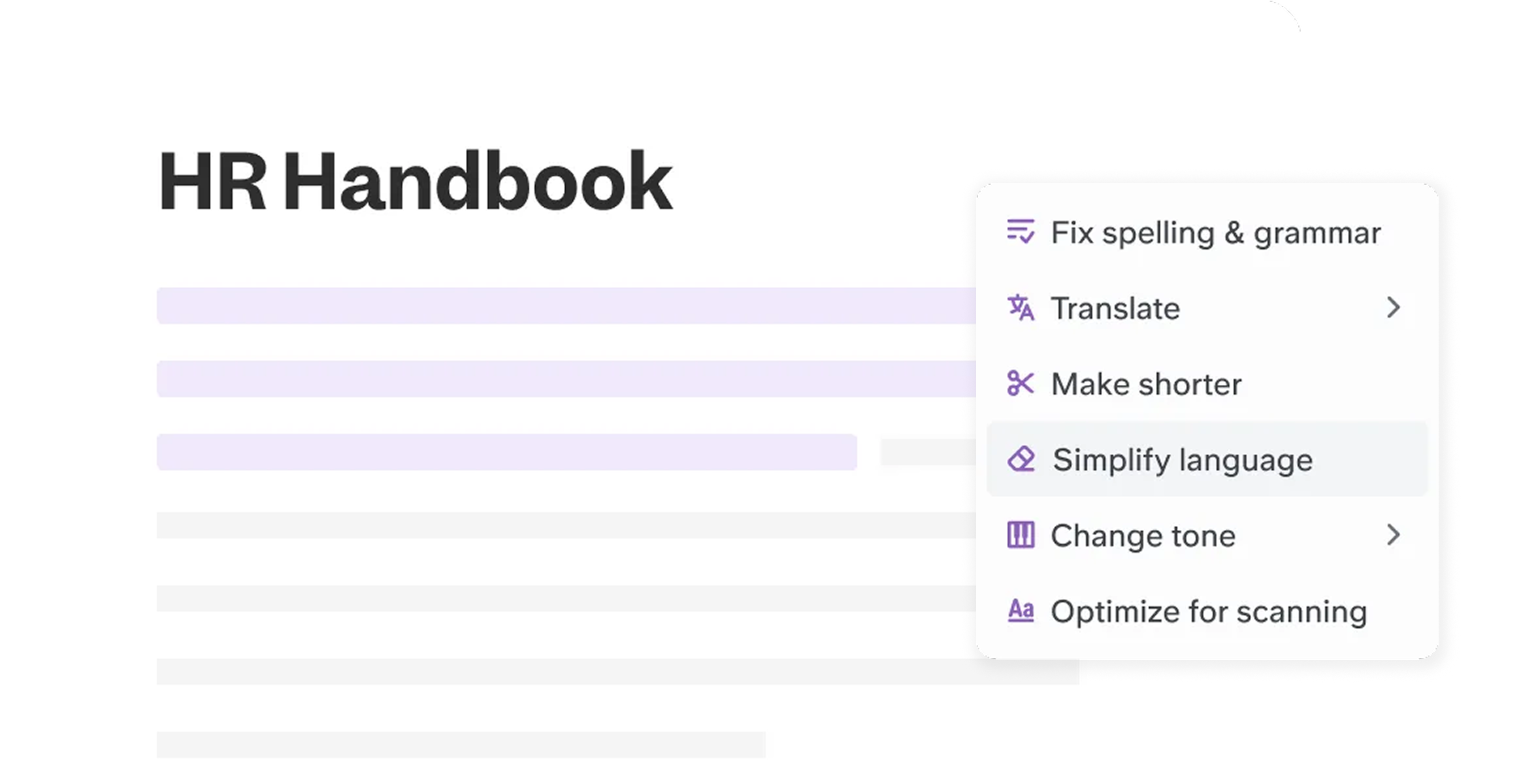 From fixing grammar to simplifying language to adjusting tone, we've got you covered. Summarize your entire doc or translate it into 15 languages in a snap. Writing your docs just got way easier!