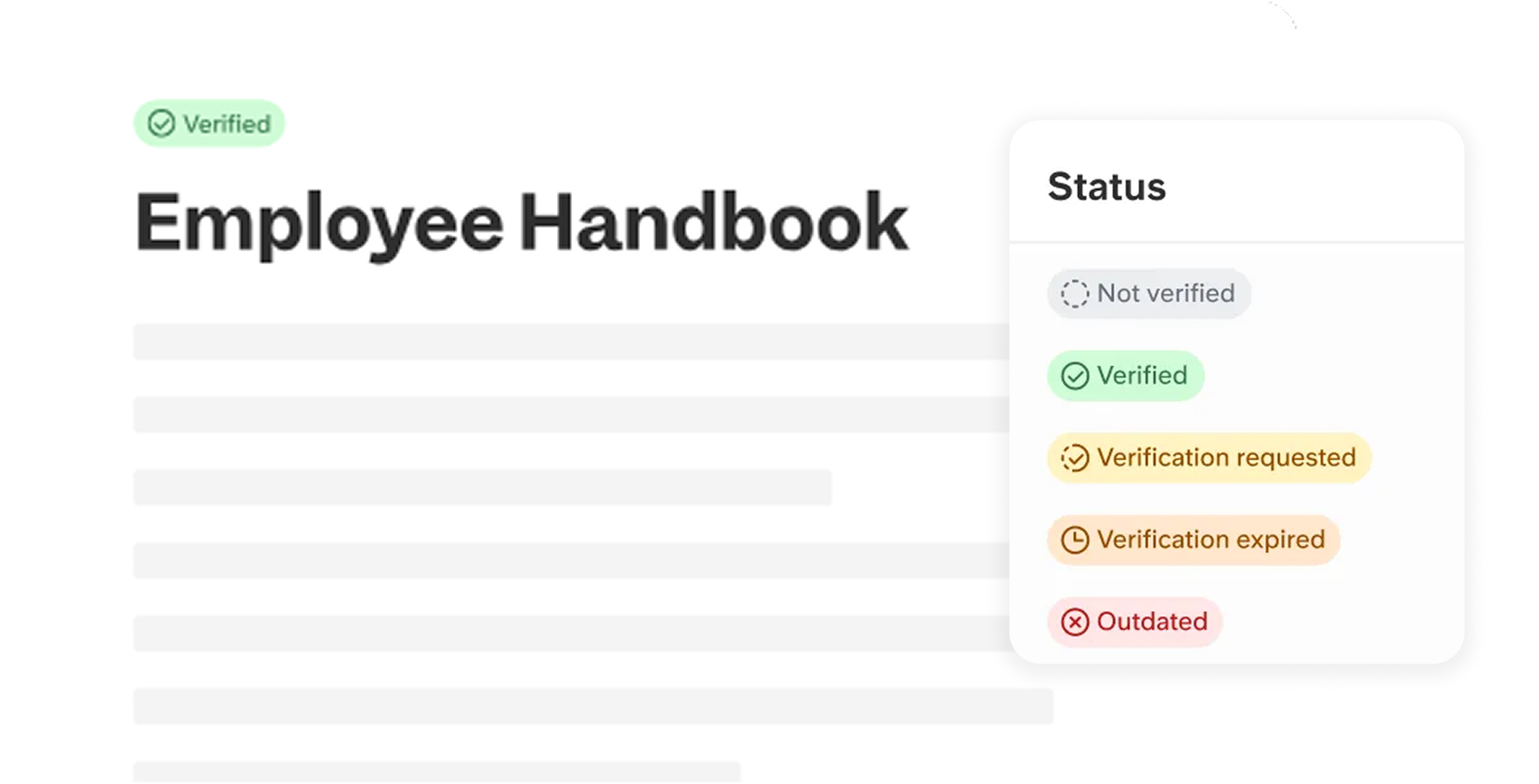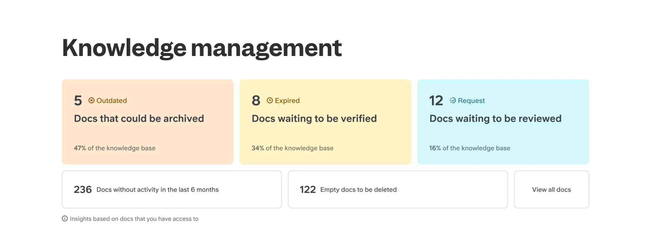 Browse all templatesNo more repetitive questions from your team to check if information is still accurate or manual work for you to keep docs relevant. Enjoy AI-driven insights that show which docs require your attention and act on them in bulk—all from one central panel.